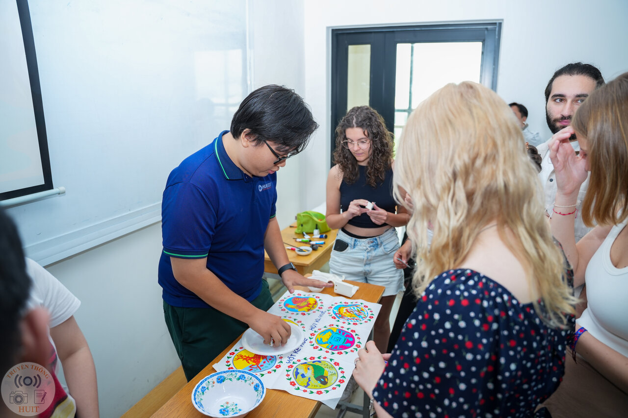 Tại buổi giao lưu, sinh viên hai trường đã cùng nhau chia sẻ những nét đặc trưng trong văn hóa, phong tục tập quán của các quốc gia thông qua các bài thuyết trình sinh động, các phần giới thiệu ẩm thực, trang phục truyền thống và trò chơi dân gian. Các bạn sinh viên đến từ Câu lạc bộ Tiếng Anh HUIT đã tích cực trong việc tổ chức hững hoạt động viết thư pháp, lắc bầu cua, chơi chuyền (chơi banh đũa)… các hoạt động này không chỉ mang lại tiếng cười mà còn giúp các bạn sinh viên quốc tế hiểu thêm về văn hóa Việt Nam một cách gần gũi và thú vị.