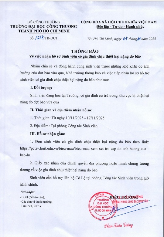 Thông báo về việc nhận hồ sơ sinh viên có gia đình chịu thiệt hại nặng do bão