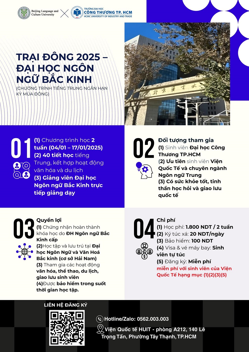 Viện Quốc Tế - Trường Đại học Công Thương TP. Hồ Chí Minh hân hoan giới thiệu chương trình Trại Đông Đại học Ngôn ngữ Bắc Kinh - Cơ sở Hải Nam 2025, một hành trình học tập và trải nghiệm văn hóa đặc biệt dành cho sinh viên yêu thích tiếng Trung và mong muốn mở rộng tầm nhìn quốc tế