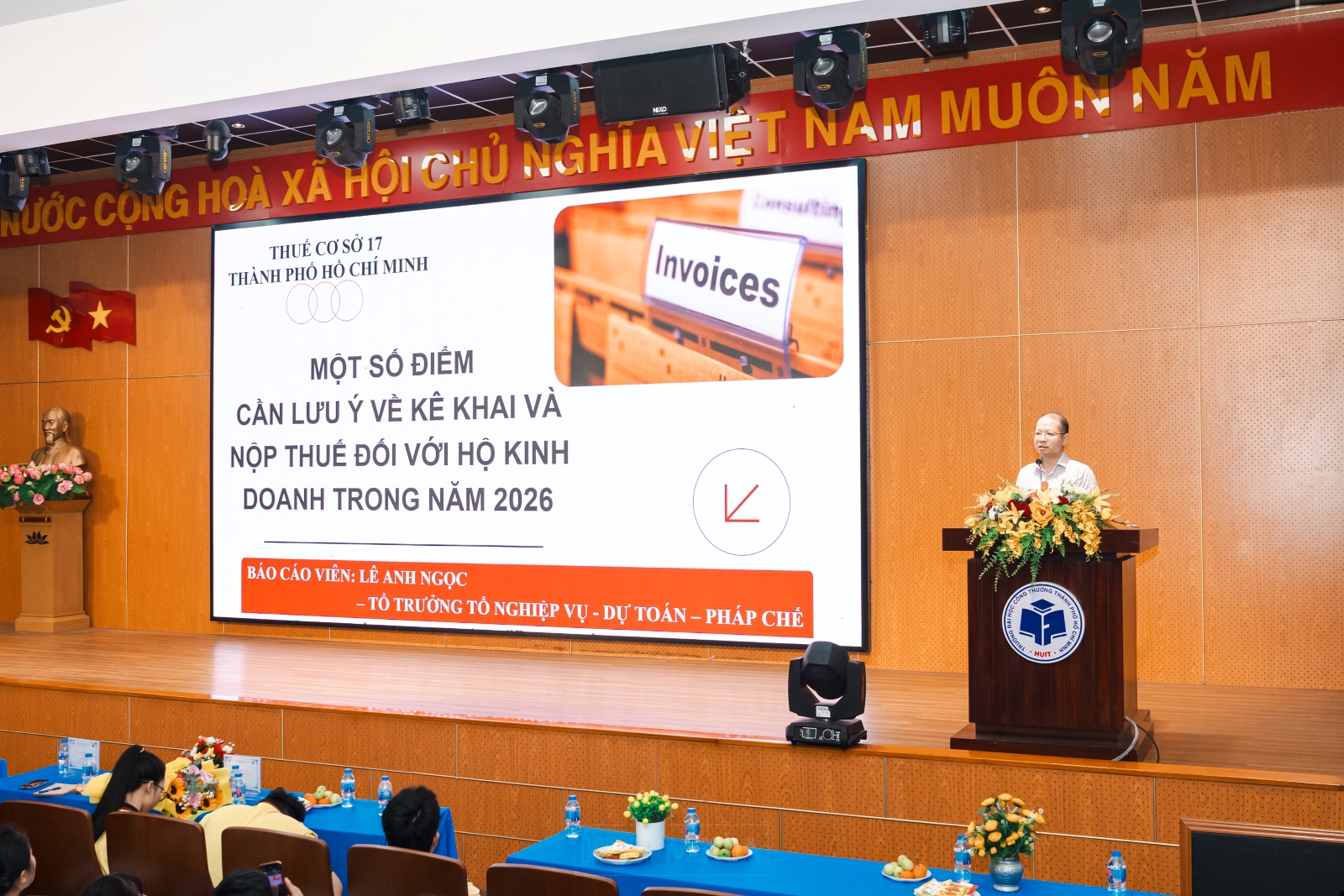 Ông Lê Anh Ngọc Tổ trưởng Tổ Nghiệp vụ - Dự toán - Pháp chế, Cơ sở Thuế 17 TP.HCM trình bày một số điểm cần lưu ý về kê khai và nộp thuế đối với hộ kinh doanh trong năm 2026