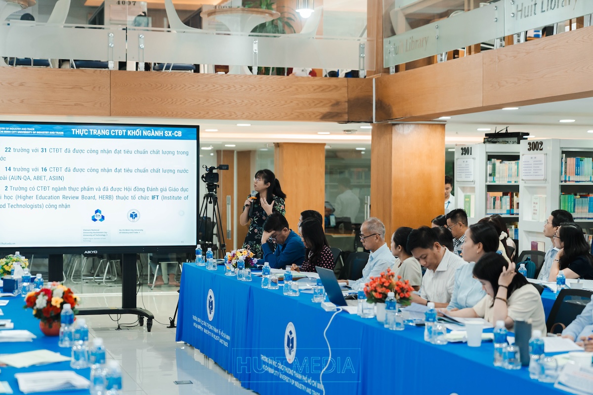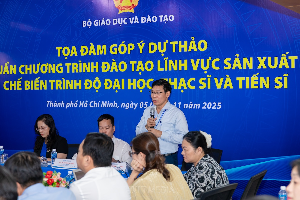 Chiều ngày 05/11/2025, tại Trường Đại học Công Thương Thành phố Hồ Chí Minh (HUIT), Bộ Giáo dục và Đào tạo phối hợp cùng Nhà trường tổ chức buổi Tọa đàm góp ý Dự thảo Chuẩn chương trình đào tạo lĩnh vực Sản xuất và Chế biến trình độ đại học, thạc sĩ và tiến sĩ. Buổi tọa đàm được tổ chức nhằm lấy ý kiến góp ý cho Dự thảo Chuẩn chương trình đào tạo lĩnh vực Sản xuất và Chế biến – một trong những bước đi chiến lược và có ý nghĩa nền tảng trong tiến trình hoàn thiện hệ thống chuẩn chương trình đào tạo quốc gia.