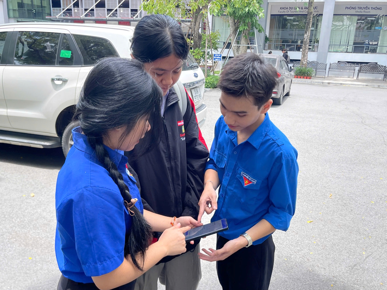 Hình ảnh các bạn tình nguyện viên hỗ trợ cho Tân sinh viên qua ứng dụng trên điện thoại
