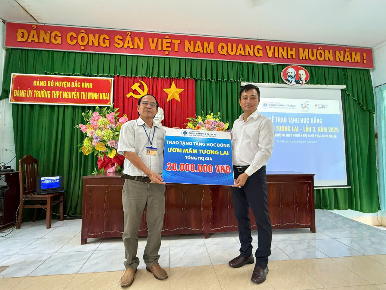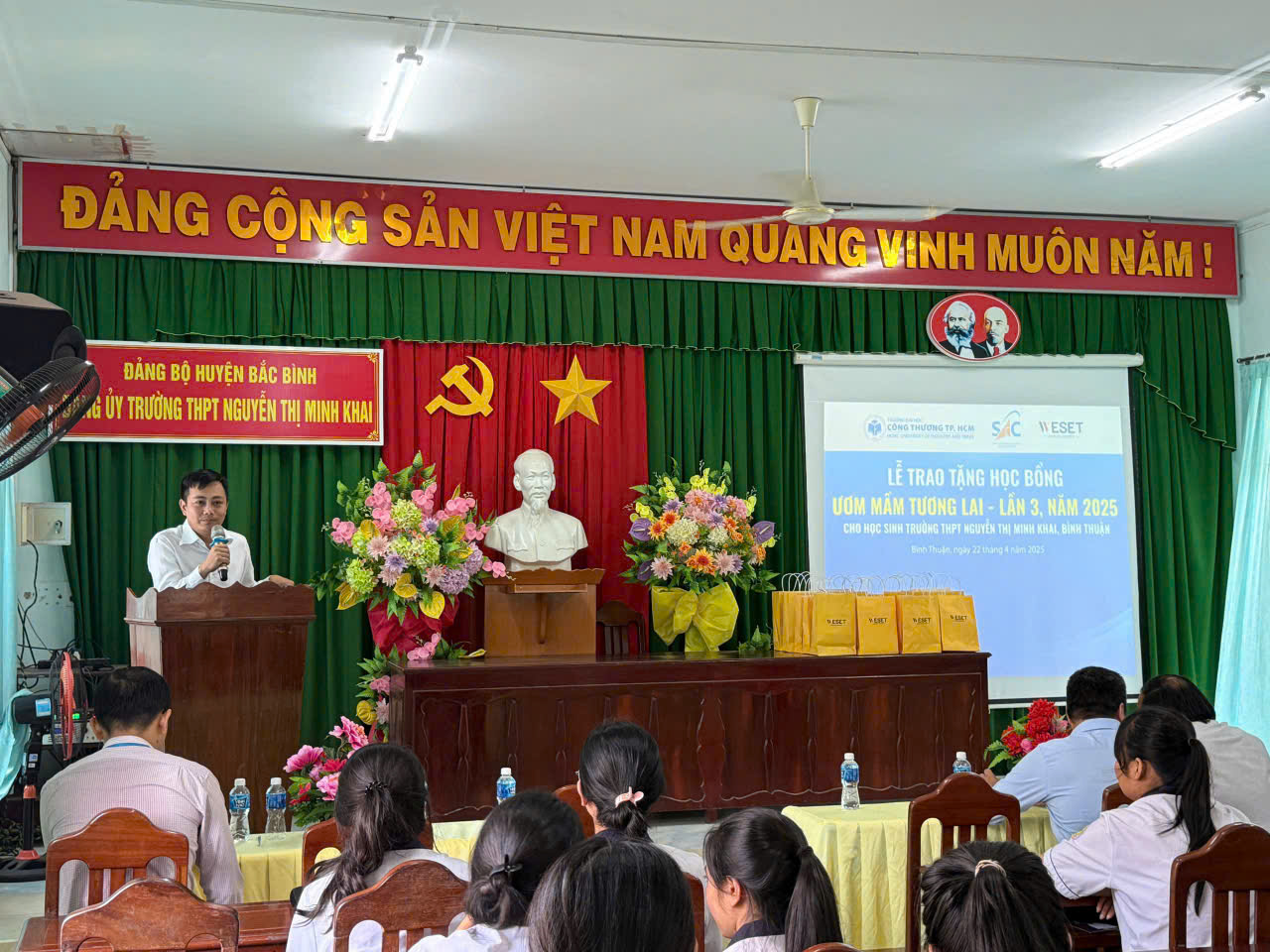 Sáng ngày 22/4/2025, Trường Đại học Công Thương TP.HCM đã phối hợp với Trung tâm Hỗ trợ Học sinh, Sinh viên TP.HCM (Thành Đoàn TP.HCM) và Trung tâm Anh ngữ WESET tổ chức Lễ trao học bổng “Ươm Mầm Tương Lai” lần thứ 3 tại trường THPT Nguyễn Thị Minh Khai, tỉnh Bình Thuận. Buổi lễ không chỉ mang ý nghĩa hỗ trợ học sinh có hoàn cảnh khó khăn mà còn mở ra những cơ hội cho các em tiếp tục học tập, phát triển bản thân và hiện thực hóa ước mơ của mình.