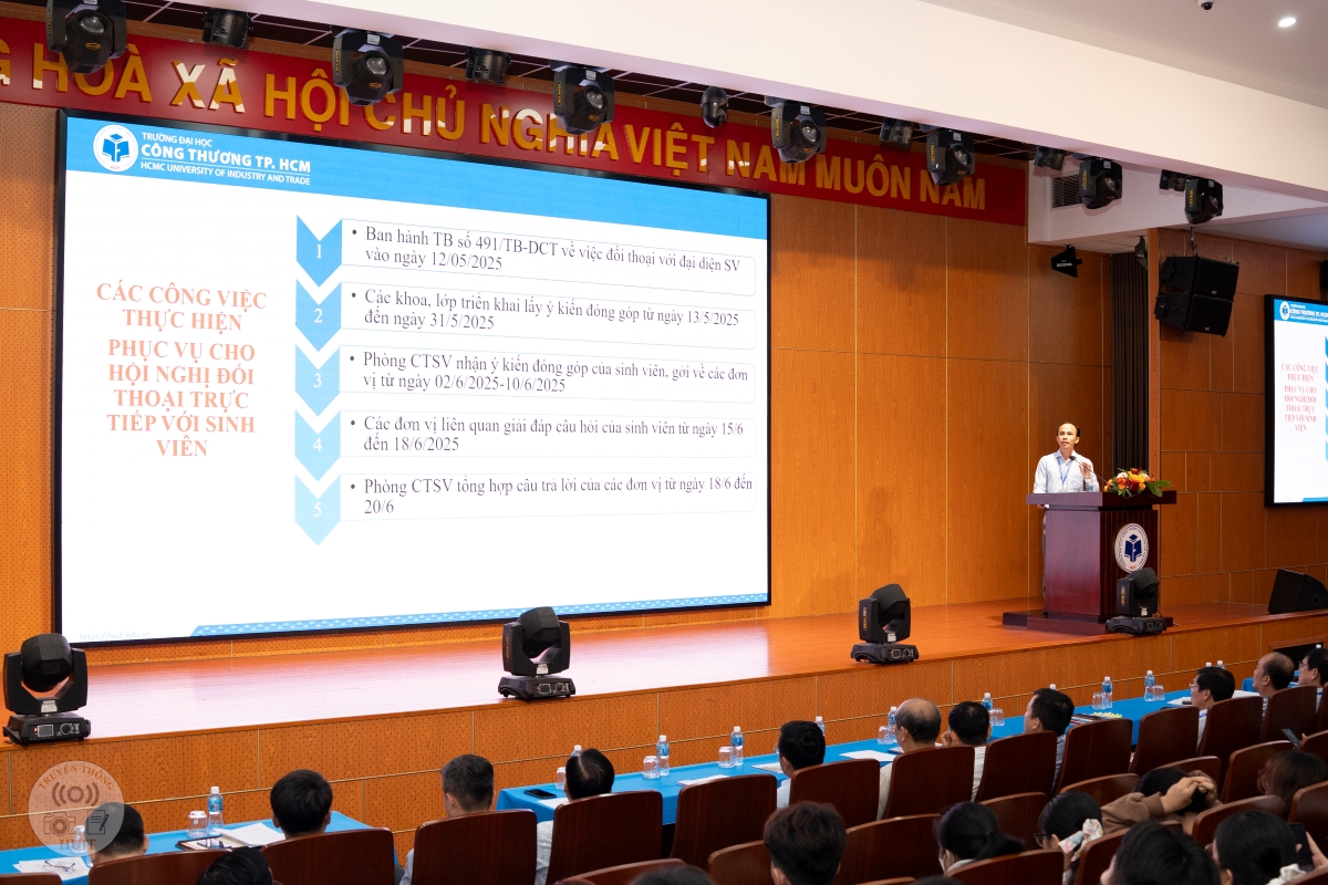 Ngày 22/6/2025, tại Trường Đại học Công Thương TP Hồ Chí Minh ( HUIT ) đã diễn ra Hội nghị “Đối thoại giữa hiệu trưởng nhà trường với đại diện sinh viên năm học 2024-2025” nhằm nắm bắt tình hình học tập, đáp ứng nhu cầu của sinh viên với lãnh đạo nhà trường. Đây là hoạt động thường niên nhằm tạo cầu nối giữa lãnh đạo nhà trường và sinh viên, từ đó lắng nghe tâm tư, nguyện vọng và kịp thời giải đáp các thắc mắc liên quan đến học tập, rèn luyện, cơ sở vật chất, chính sách hỗ trợ và định hướng nghề nghiệp...