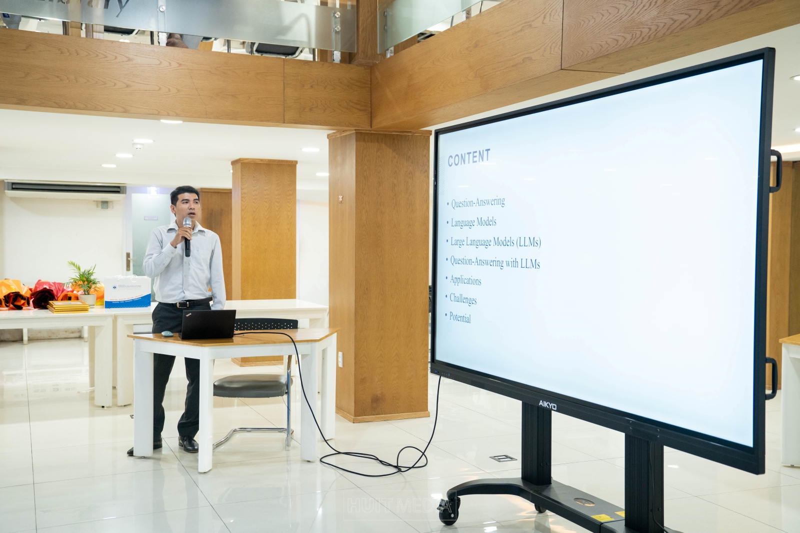 Chủ đề “Hệ thống hỏi – trả lời dùng mô hình ngôn ngữ lớn”, Thầy Hồ Long Vân đem đến cái nhìn tổng quan về các mô hình ngôn ngữ lớn như ChatGPT, GPT - 4, và ứng dụng của chúng trong nhiều lĩnh vực, đặc biệt là giáo dục và y tế.