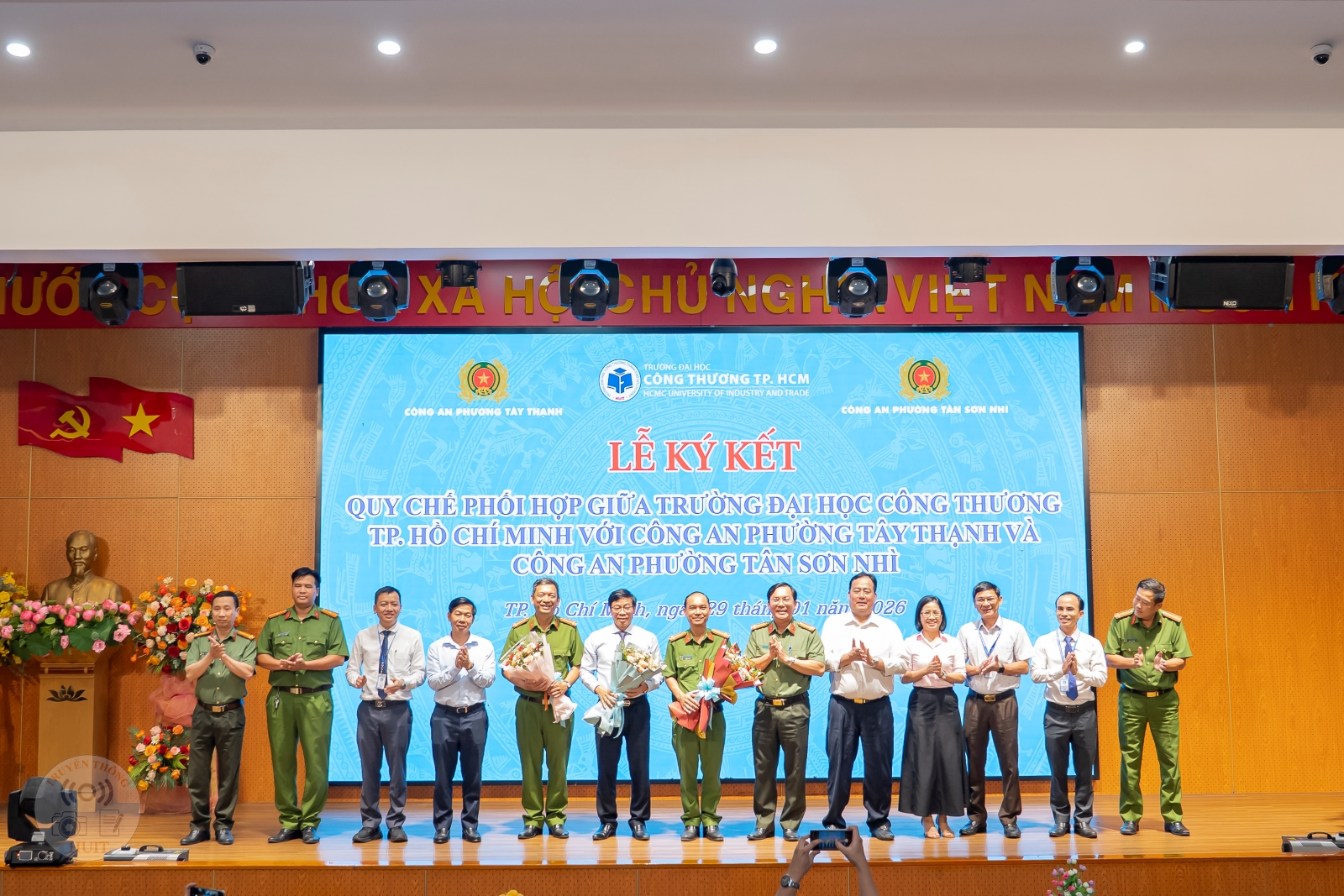 Chiều ngày 29/01/2026, với sự đồng thuận và nhất trí cao giữa các bên, Trường Đại học Công Thương TP. Hồ Chí Minh phối hợp với Công an phường Tây Thạnh và Công an phường Tân Sơn Nhì đã tổ chức Lễ ký kết Quy chế phối hợp trong công tác bảo đảm an ninh quốc gia, trật tự an toàn xã hội, đấu tranh phòng, chống tội phạm và các vi phạm pháp luật khác trong ngành Giáo dục (giai đoạn 2025 - 2030) diễn ra tại Hội trường C.