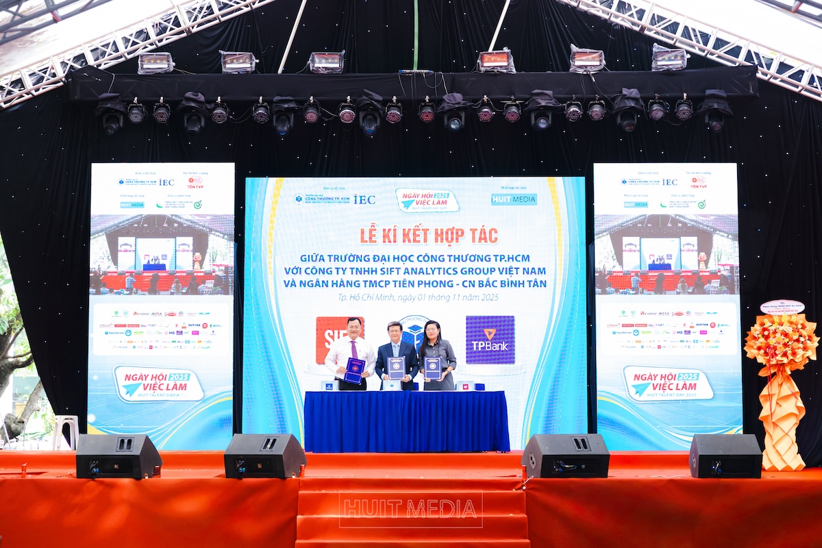 Ngay sau lễ khai mạc là phần ký kết hợp tác giữa Trường Đại học Công Thương TP.HCM và 12 doanh nghiệp tiêu biểu, đánh dấu bước phát triển mới trong mối quan hệ hợp tác chiến lược giữa các bên về đào tạo, thực tập và cơ hội việc làm sau tốt nghiệp. Các doanh nghiệp tham gia ký kết gồm Công ty TNHH Sift Analytics Group Việt Nam, Ngân hàng Tiên Phong TPBank, Công ty Tín Phát, Ô tô Trường Chinh, Siêu Nhật Thanh, JobsGO, MBBank, Earth Corporation, Chi nhánh Công ty Mặt Trời Phú Quốc, Viện Phát triển Khoa học Công nghệ & Giáo dục, Hiệp hội Thực phẩm Minh Bạch (AFT) và Công ty HUBBIZ. Sự kiện ký kết được xem là minh chứng rõ nét cho định hướng phát triển bền vững của HUIT – đào tạo gắn liền với thực tiễn doanh nghiệp.