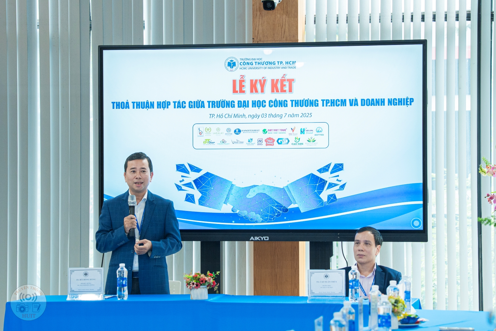 Phát biểu tại buổi lễ, TS. Bùi Hồng Đăng – Phó Hiệu trưởng, phụ trách Hội đồng Trường, đã chia sẻ những kỳ vọng về sự hợp tác lâu dài và bền vững giữa Trường Đại học Công Thương TP.HCM và các doanh nghiệp trong ngành Du lịch và Ẩm thực. Ông nhấn mạnh tầm quan trọng của việc gắn kết nhà trường với doanh nghiệp trong bối cảnh hiện nay:"Trong thời đại kỷ nguyên số, sự kết nối chặt chẽ giữa nhà trường và doanh nghiệp không chỉ là cơ hội mà còn là yêu cầu cấp thiết để đào tạo nguồn nhân lực chất lượng, đáp ứng nhu cầu thực tiễn của ngành. Mối quan hệ này không chỉ mang lại lợi ích thiết thực cho sinh viên mà còn đóng góp vào sự phát triển bền vững của ngành Du lịch và Ẩm thực, nâng cao giá trị của nghề nghiệp và tạo ra những cơ hội việc làm rộng mở cho thế hệ sinh viên tương lai".