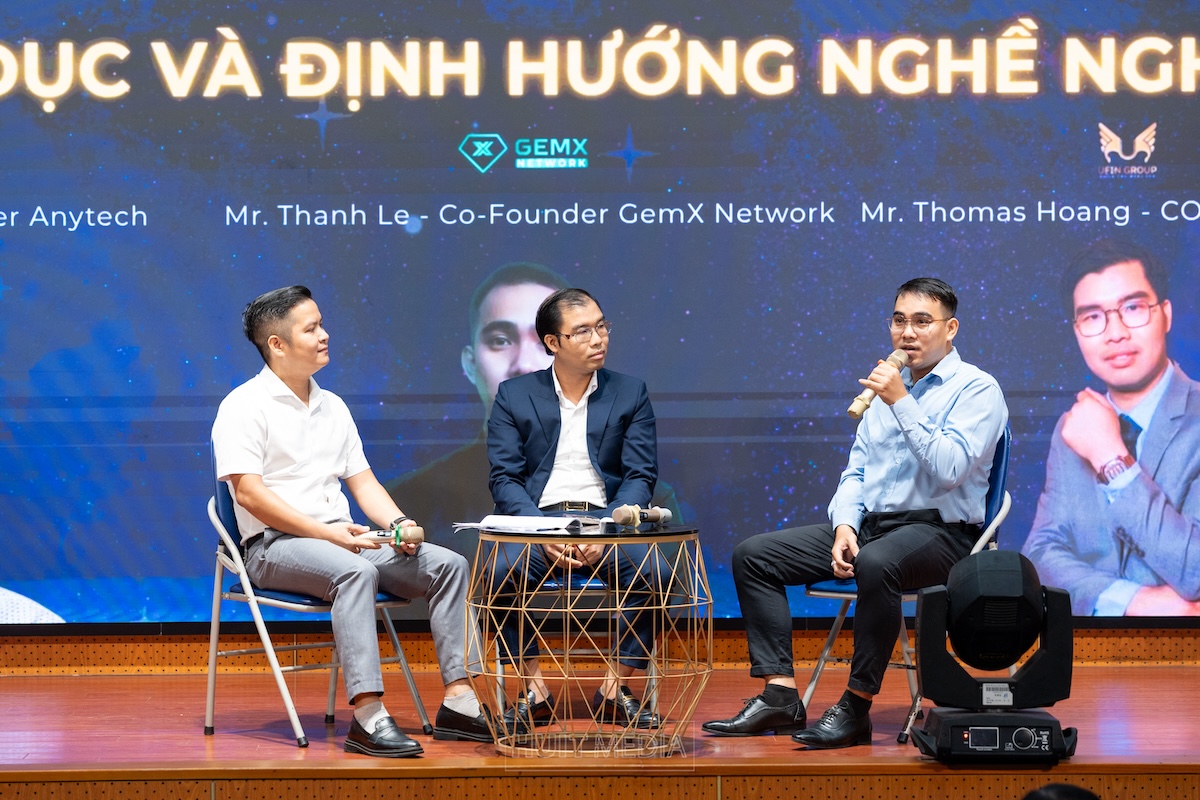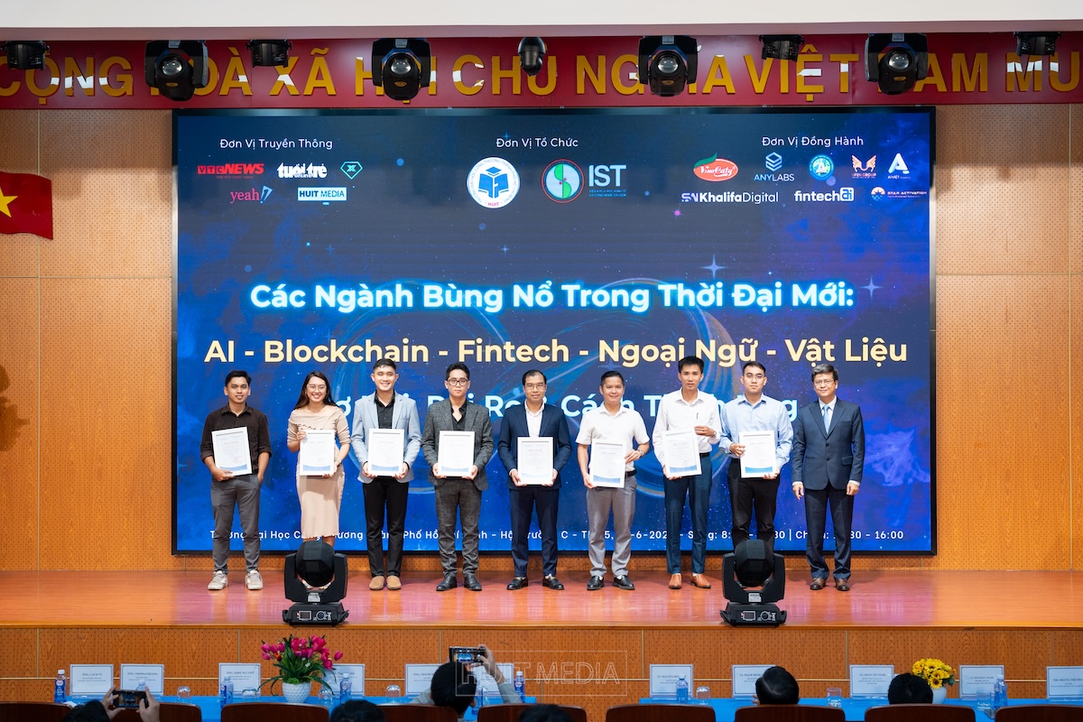 Trong phần chia sẻ chuyên đề “AI & Blockchain: Ứng dụng trong Thương mại, Giáo dục và Định hướng Nghề nghiệp”. Các diễn giả phân tích cách AI và Blockchain góp phần tối ưu hóa thương mại, cá nhân hóa giáo dục và mở ra những xu hướng nghề nghiệp mới. Bên cạnh tiềm năng, buổi chia sẻ cũng cảnh báo những hệ lụy như sự lệ thuộc vào công nghệ, mất việc do tự động hóa, và các vấn đề đạo đức liên quan đến AI. Qua đó, sinh viên được khuyến khích học hỏi công nghệ một cách chủ động, sáng tạo và có trách nhiệm, sẵn sàng thích nghi và tạo giá trị trong thời đại số.