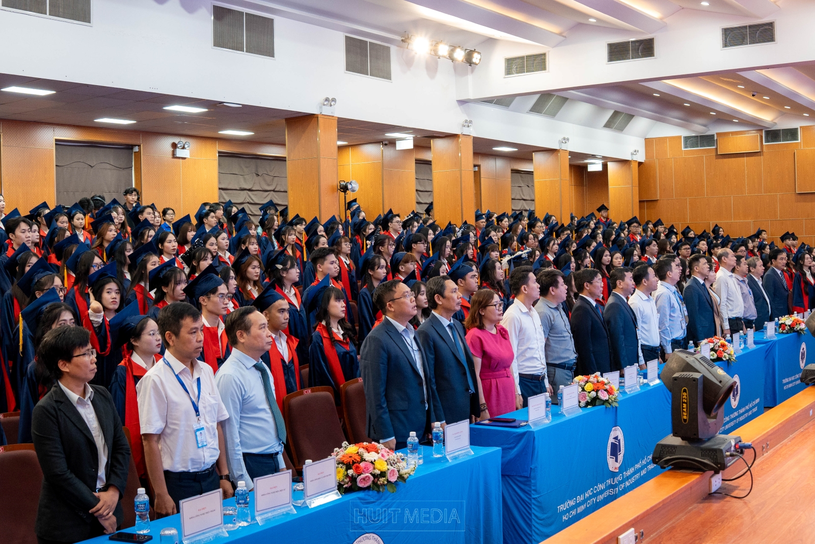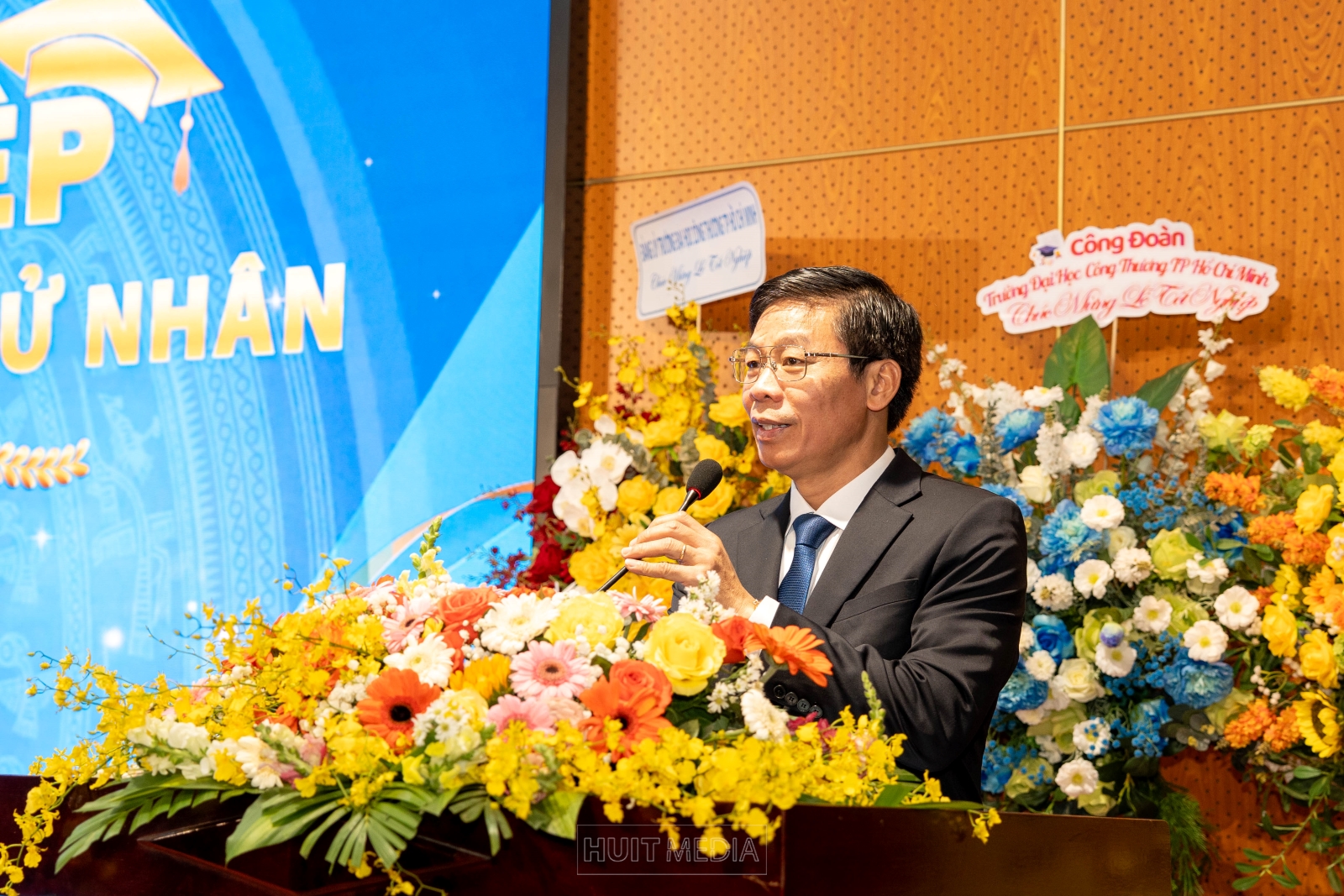 NGƯT. PGS.TS Nguyễn Xuân Hoàn – Hiệu trưởng nhà trường chia sẻ: “Hôm nay, các em đã hoàn thành một chặng đường quan trọng trong cuộc đời mình. Tôi hy vọng các em sẽ tiếp tục phát huy những kiến thức đã học và những giá trị đạo đức được rèn luyện tại trường để góp phần xây dựng xã hội ngày càng tốt đẹp hơn. Trường Đại học Công Thương TP. Hồ Chí Minh luôn tự hào là nơi các em bắt đầu hành trình của mình, và chúng tôi sẽ luôn ở đây để hỗ trợ các em trong những bước đi tiếp theo. Hãy luôn thể hiện mình là một người của HUIT kiêu hãnh, có học thức, sống có trách nhiệm và cư xử nhân ái. Hôm qua là HUFI, ngày nay là ĐH Công Thương TP. HCM nhưng mãi “như bến đợi” luôn dõi theo và mong người trở lại”.