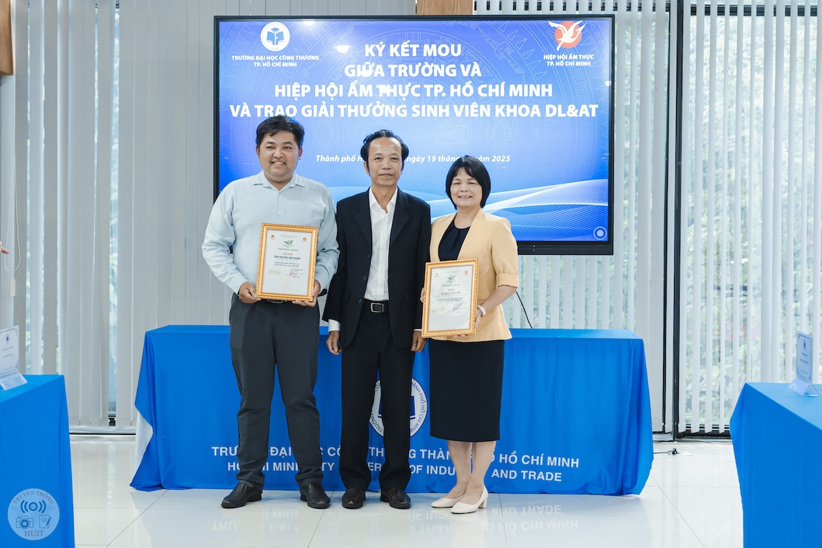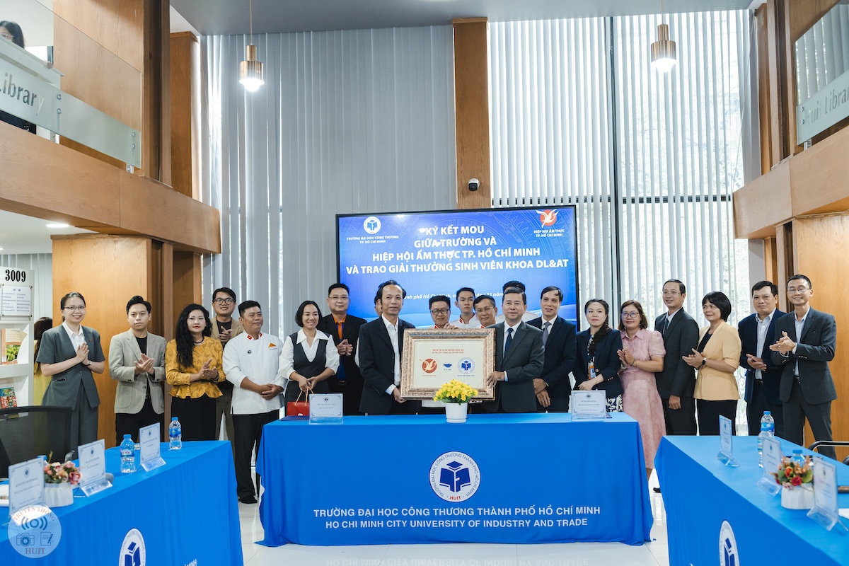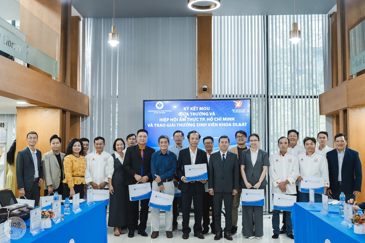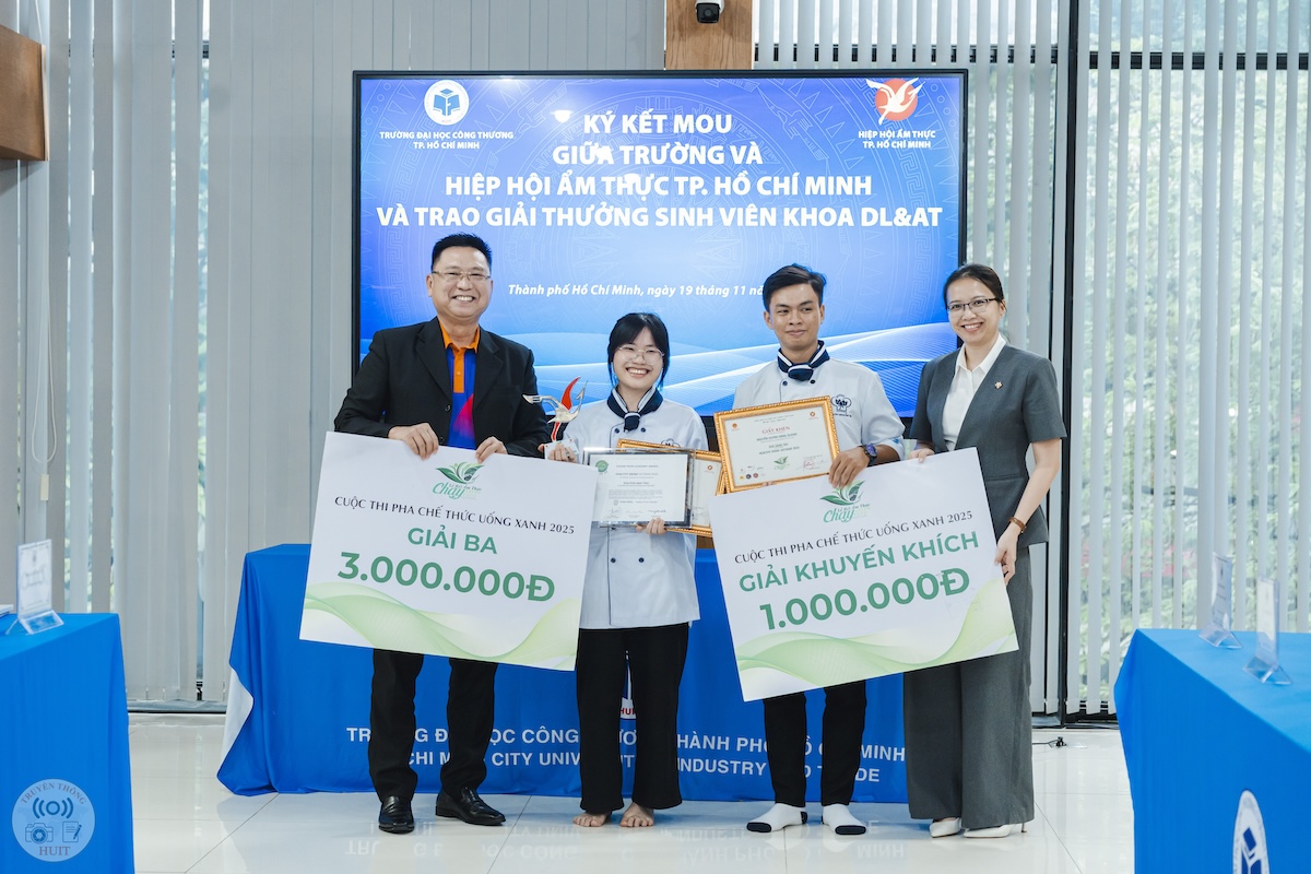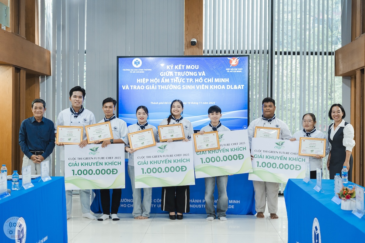 Vừa qua, ngày 19/11, tại Trường Đại học Công Thương TP.HCM (HUIT), lễ ký kết biên bản ghi nhớ hợp tác (MOU) giữa nhà trường và Hiệp hội Ẩm thực TP.HCM đã diễn ra trong không khí trang trọng, ghi dấu một bước tiến trong liên kết đào tạo — doanh nghiệp. Tại sự kiện, HUIT vinh dự nhận chứng nhận đồng hành trong chương trình xác lập kỷ lục “220 món chay từ sen”, đồng thời đội tuyển nhà trường xuất sắc giành giải Green Future Chef và nhiều giải thưởng ở hạng mục pha chế. Sự kiện không chỉ mở ra cơ hội mở rộng hợp tác về đào tạo, thực hành và phát triển nguồn nhân lực chất lượng cao, mà còn thể hiện cam kết của nhà trường và hiệp hội trong việc thúc đẩy ẩm thực bền vững, sáng tạo và gắn kết cộng đồng.