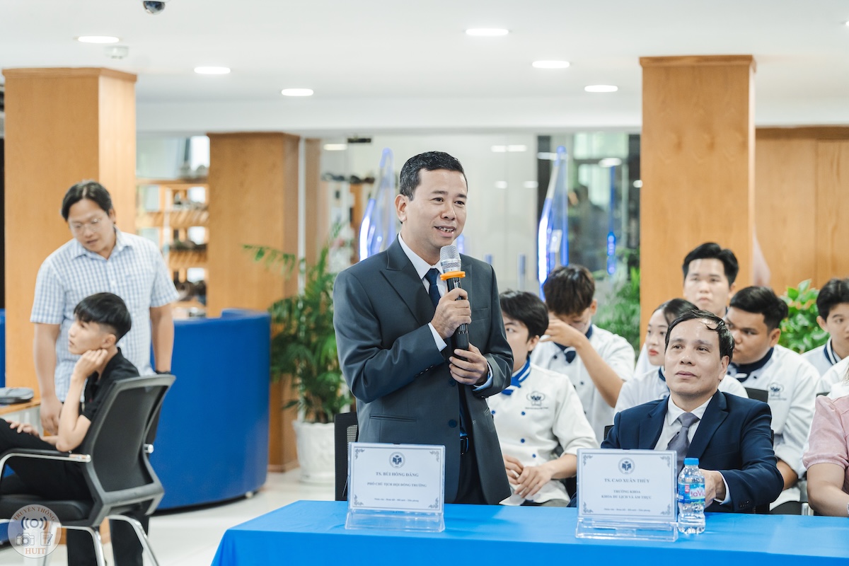 Mở đầu sự kiện, TS. Bùi Hồng Đăng - Phó Chủ tịch phụ trách Hội đồng trường đã phát biểu khai mạc, gửi lời chúc tốt đẹp đến đại biểu, doanh nghiệp và sinh viên, đồng thời nhấn mạnh tầm quan trọng của mối liên kết giữa nhà trường và Hiệp hội Ẩm thực TP.HCM trong việc nâng cao chất lượng đào tạo, mở rộng cơ hội nghề nghiệp và khẳng định vị thế của HUIT trong lĩnh vực Du lịch & Ẩm thực. Lời phát biểu đã thể hiện rõ định hướng chiến lược của Nhà trường trong việc thúc đẩy mô hình đào tạo gắn liền thực tiễn, đặt sinh viên làm trung tâm, phát triển toàn diện kỹ năng nghề nghiệp.