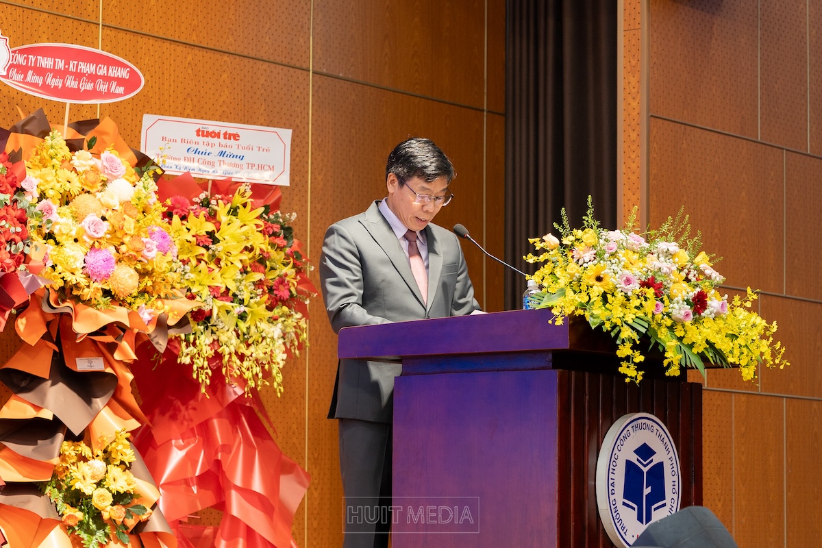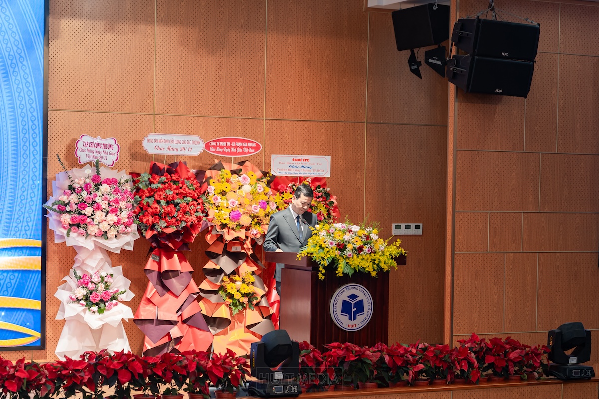 Trong phần phát biểu chúc mừng, NGƯT.PGS.TS. Nguyễn Xuân Hoàn – Bí thư Đảng ủy, Hiệu trưởng Nhà trường – trân trọng gửi lời tri ân sâu sắc đến toàn thể đội ngũ giảng viên, viên chức và người lao động đang công tác tại HUIT. Thầy nhấn mạnh, trong suốt chặng đường phát triển, nhà trường luôn tự hào về tập thể nhà giáo tâm huyết, tận tụy, không ngừng đổi mới phương pháp giảng dạy, tích cực nghiên cứu khoa học, gắn kết với doanh nghiệp để nâng cao chất lượng đào tạo, vì sự trưởng thành và thành công của sinh viên. Đồng thời, Hiệu trưởng cũng gửi gắm niềm tin vào thế hệ trẻ HUIT – những sinh viên năng động, sáng tạo, sẽ tiếp tục phát huy truyền thống hiếu học, nỗ lực học tập, rèn luyện để trở thành nguồn nhân lực chất lượng cao, đóng góp cho sự phát triển của đất nước.