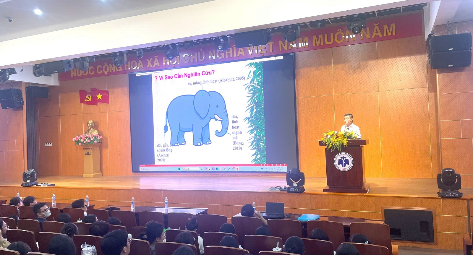 Mở đầu chương trình, TS. Trần Tín Nghị – Trưởng Khoa Ngoại ngữ – đã gửi đến sinh viên lời nhắn nhủ đầy tâm huyết về tầm quan trọng của nghiên cứu khoa học. Thầy nhấn mạnh rằng nghiên cứu không chỉ là yêu cầu học thuật phục vụ đồ án và khóa luận tốt nghiệp mà còn là hành trang giúp sinh viên rèn luyện tư duy phản biện, khả năng giải quyết vấn đề và kỹ năng viết học thuật – những yếu tố then chốt cho sự nghiệp sau khi ra trường.
